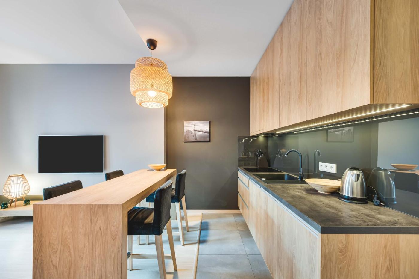 Oferta apartamentu obejmuje sypialnię (1), salon, aneks kuchenny z pełnym wyposażeniem, w tym lodówką i ekspresem do kawy, a także łazienkę (1) z prysznicem oraz bezpłatnym zestawem kosmetyków. W apartamencie zapewniono ręczniki i pościel.