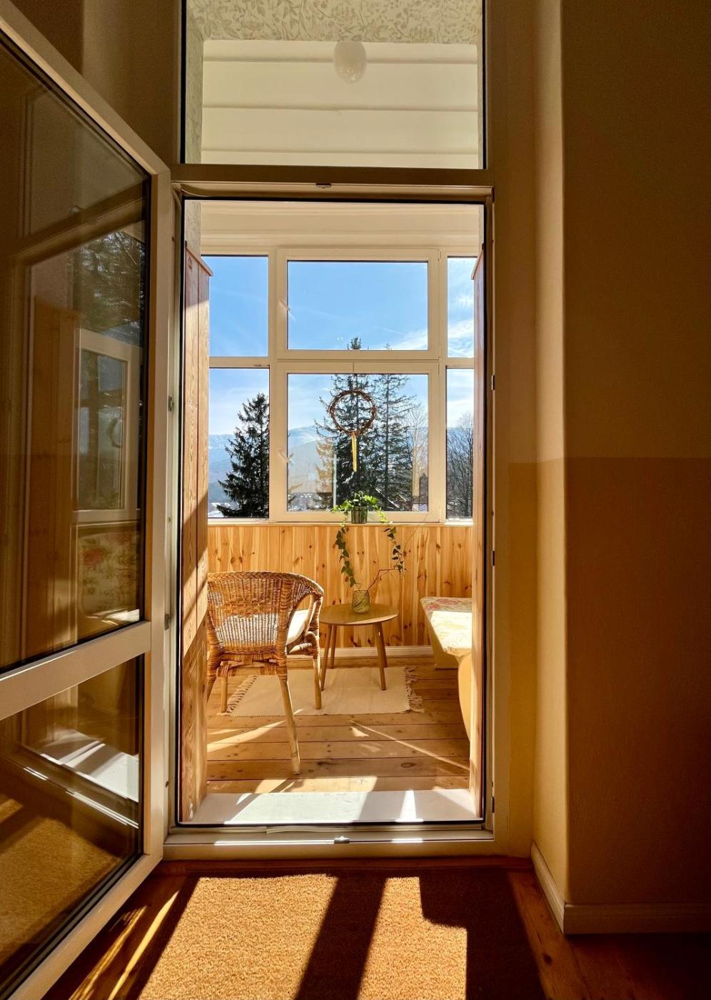Zobacz cenęZdjęcia Weranda Śnieżka klimatyczne mieszkanie z widokiem na Śnieżkę 10 minut do wyciągów i Świątyni Wang, parking w cenie