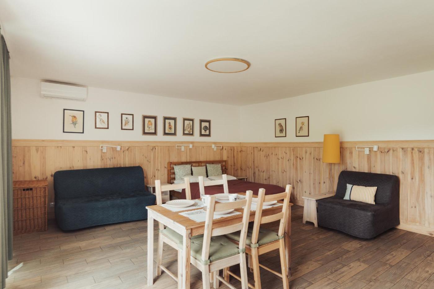 Studio. The studios kitchenette, which has a refrigerator and kitchenware, is available for cooking and storing food. The studio features a private entrance, a tea and coffee maker, a terrace with lake views as well as a private bathroom boasting a shower. The unit has 3 beds. Studio - 4 osobowy. Powierzchnia pokoju ok.: 40 mkw.